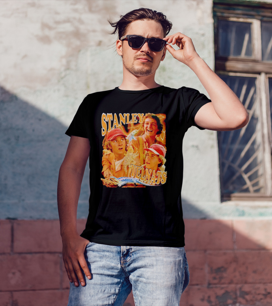 Stanley Yelnats Character Collage with Orange Background and Lizard Shirt made from 100% pre-shrunk ring-spun cotton, unisex regular fit based on U.S. standard sizing. The shirt is designed, cut, sewn, and printed in the United States. Available in sizes S-5XL.
