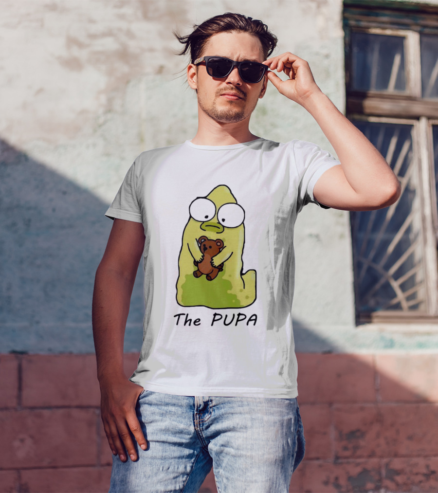 The Pupa Holding Teddy Bear Solar Opposites Shirt made from 100% pre-shrunk ring-spun cotton, unisex regular fit based on U.S. standard sizing. The shirt is designed, cut, sewn, and printed in the United States. Available in sizes S-5XL.