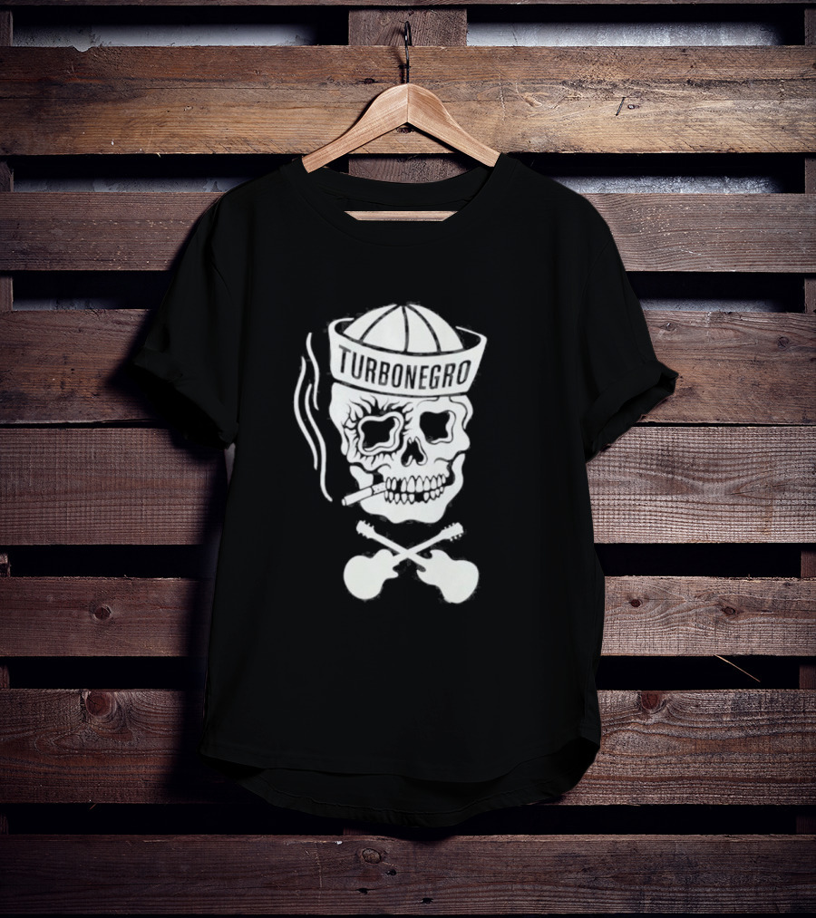 Turbonegro Sailor Skull Smoking with Crossed Guitars Shirt made from 100% pre-shrunk ring-spun cotton, unisex regular fit based on U.S. standard sizing. The shirt is designed, cut, sewn, and printed in the United States. Available in sizes S-5XL.