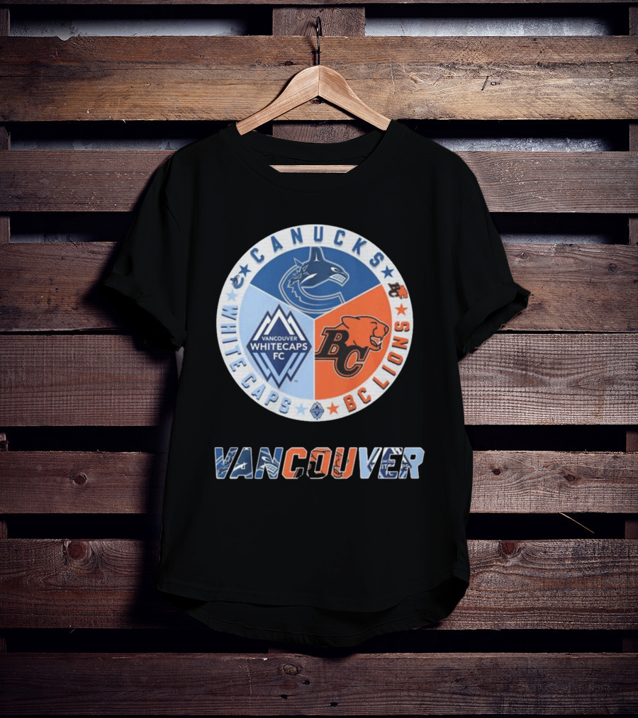 Vancouver Canucks Whitecaps BC Lions Logos Emblem Shirt made from 100% pre-shrunk ring-spun cotton, unisex regular fit based on U.S. standard sizing. The shirt is designed, cut, sewn, and printed in the United States. Available in sizes S-5XL.