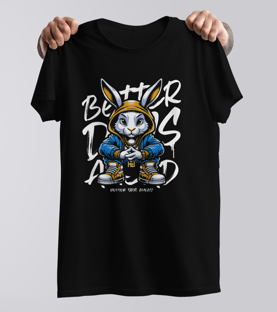 Better Days Ahead Cool Bunny in Hoodie and Sneakers Shirt made from 100% pre-shrunk ring-spun cotton, unisex regular fit based on U.S. standard sizing. The shirt is designed, cut, sewn, and printed in the United States. Available in sizes S-5XL.