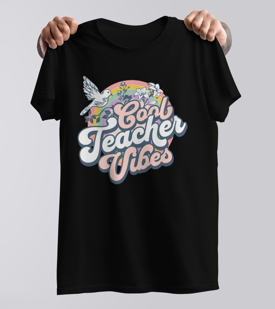 Cool Teacher Vibes Retro Rainbow Floral Design With Dove T-Shirt