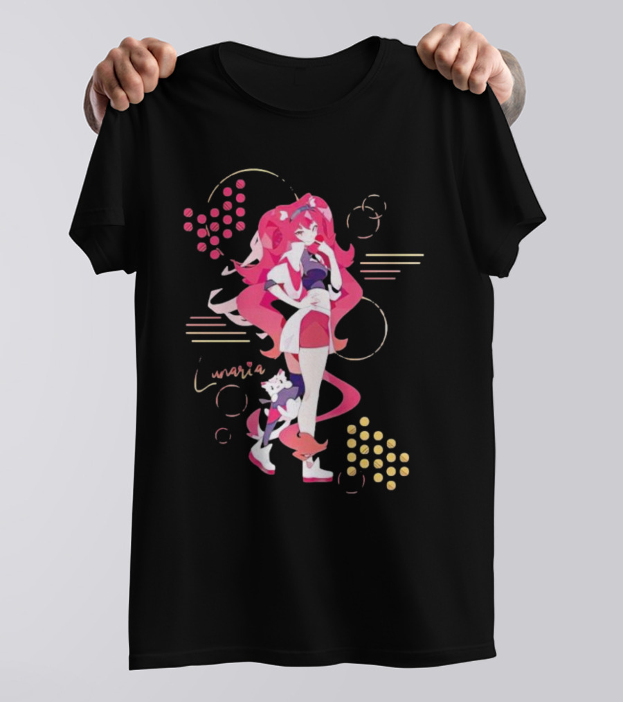 Lunaria Streetwear Pink Hair Girl with Cat and Circles Shirt made from 100% pre-shrunk ring-spun cotton, unisex regular fit based on U.S. standard sizing. The shirt is designed, cut, sewn, and printed in the United States. Available in sizes S-5XL.