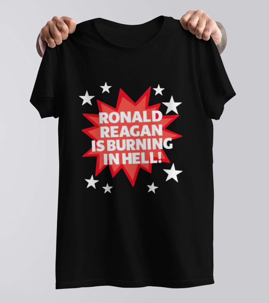 Ronald Reagan Is Burning in Hell Starburst Shirt made from 100% pre-shrunk ring-spun cotton, unisex regular fit based on U.S. standard sizing. The shirt is designed, cut, sewn, and printed in the United States. Available in sizes S-5XL.
