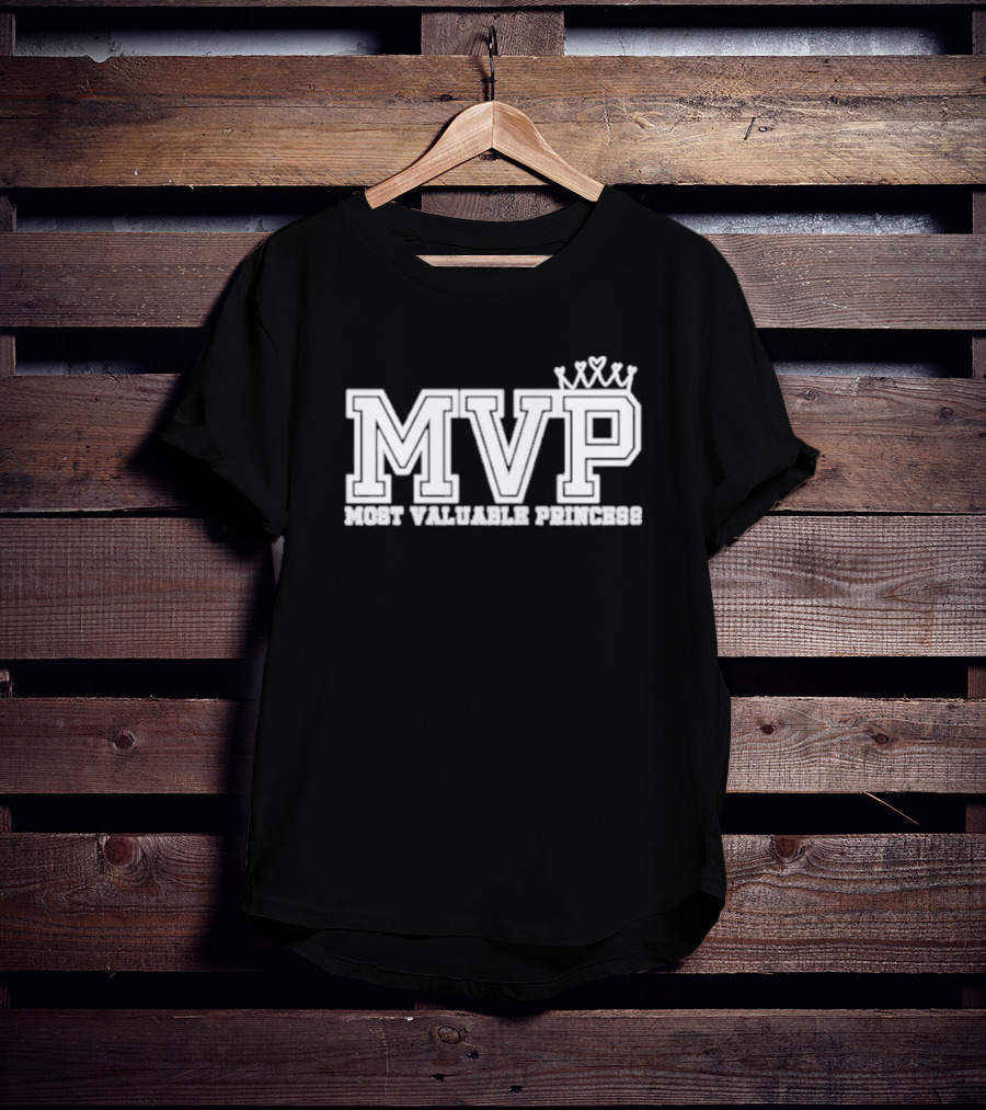 MVP Most Valuable Princess Crown Shirt made from 100% pre-shrunk ring-spun cotton, unisex regular fit based on U.S. standard sizing. The shirt is designed, cut, sewn, and printed in the United States. Available in sizes S-5XL.