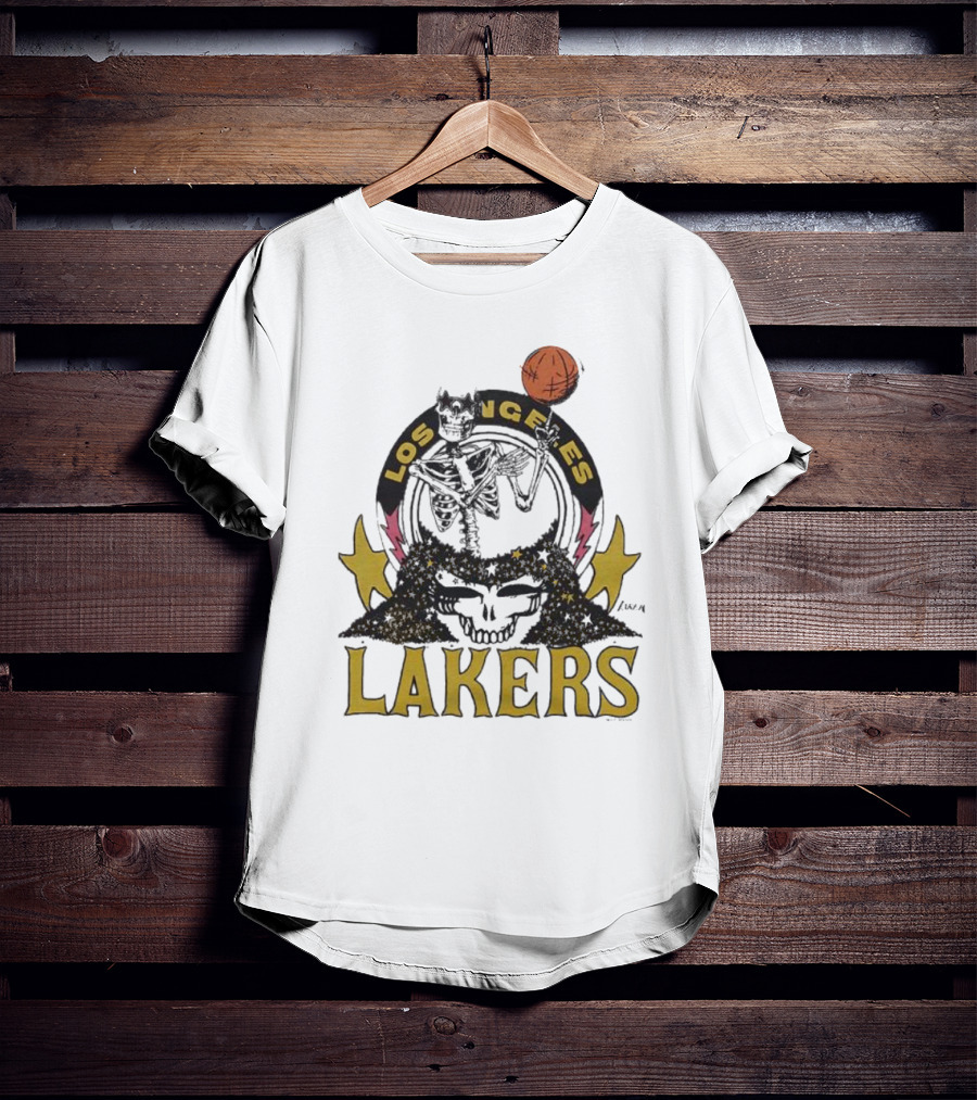 Los Angeles Lakers Grateful Dead Basketball Skull Shirt made from 100% pre-shrunk ring-spun cotton, unisex regular fit based on U.S. standard sizing. The shirt is designed, cut, sewn, and printed in the United States. Available in sizes S-5XL.