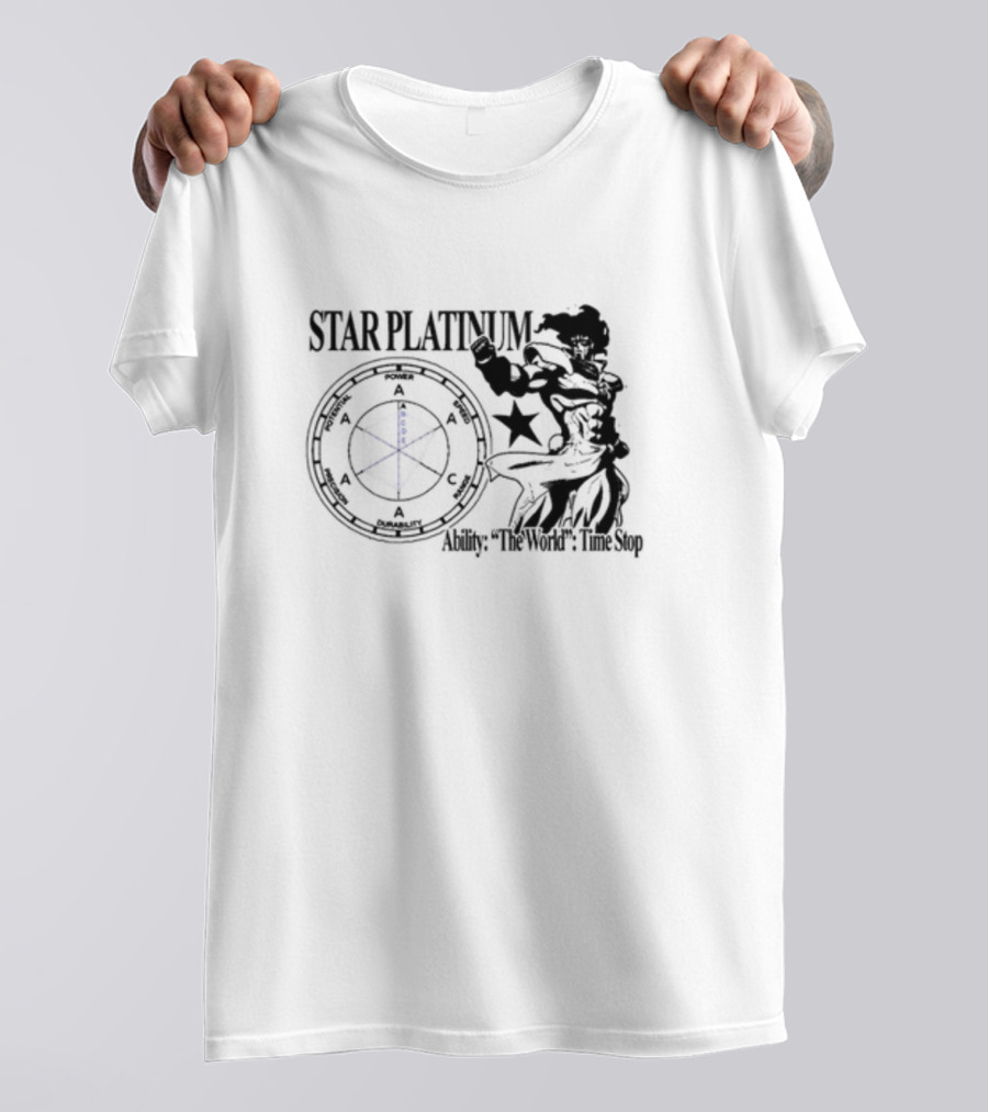 Star Platinum Ability The World Time Stop Diagram and Heroic Pose Shirt made from 100% pre-shrunk ring-spun cotton, unisex regular fit based on U.S. standard sizing. The shirt is designed, cut, sewn, and printed in the United States. Available in sizes S-5XL.
