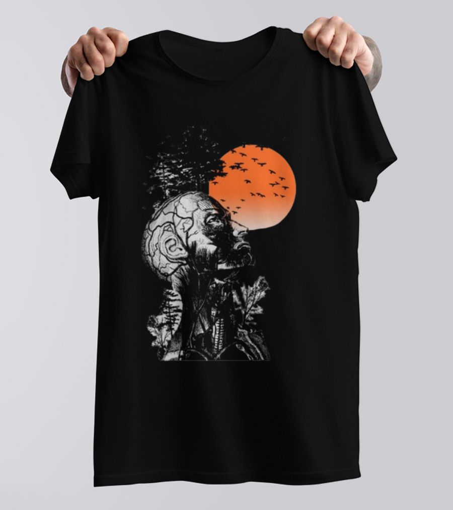 Hangover Alan Human Anatomy Tree Brain Pattern Orange Moon Dark Khaki Shirt made from 100% pre-shrunk ring-spun cotton, unisex regular fit based on U.S. standard sizing. The shirt is designed, cut, sewn, and printed in the United States. Available in sizes S-5XL.