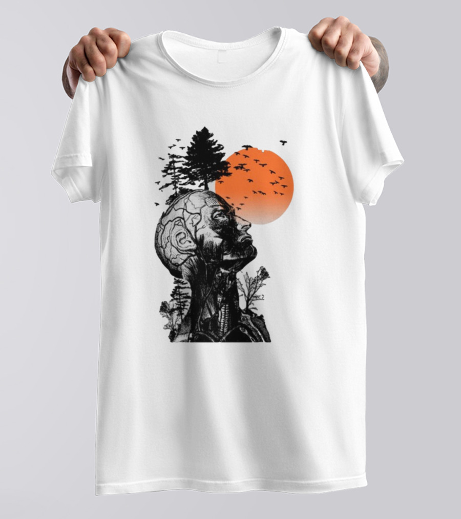 Jason Kelce Hangover Brain Anatomy with Sunset and Flying Birds Shirt made from 100% pre-shrunk ring-spun cotton, unisex regular fit based on U.S. standard sizing. The shirt is designed, cut, sewn, and printed in the United States. Available in sizes S-5XL.