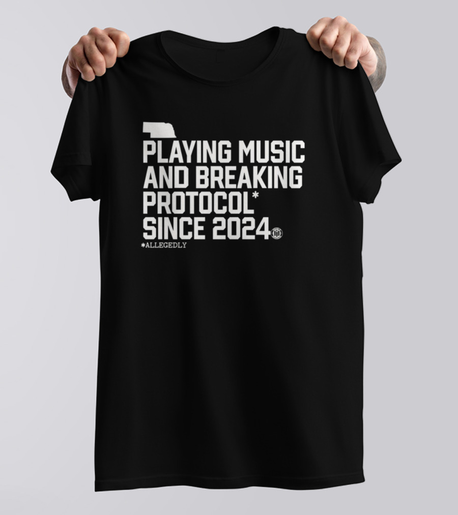 Playing Music and Breaking Protocol Allegedly Since Shirt made from 100% pre-shrunk ring-spun cotton, unisex regular fit based on U.S. standard sizing. The shirt is designed, cut, sewn, and printed in the United States. Available in sizes S-5XL.