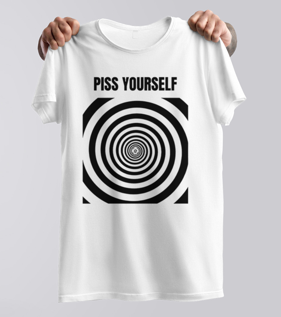 Sillyteestudio Piss Yourself Hypnotic Spiral Shirt made from 100% pre-shrunk ring-spun cotton, unisex regular fit based on U.S. standard sizing. The shirt is designed, cut, sewn, and printed in the United States. Available in sizes S-5XL.