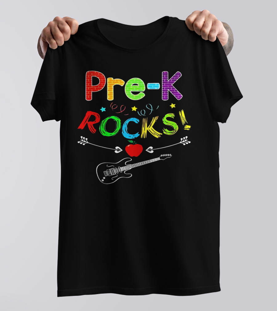 Pre-K Rocks Funny Kids Teachers Back To School With Guitar And Apple T-Shirt