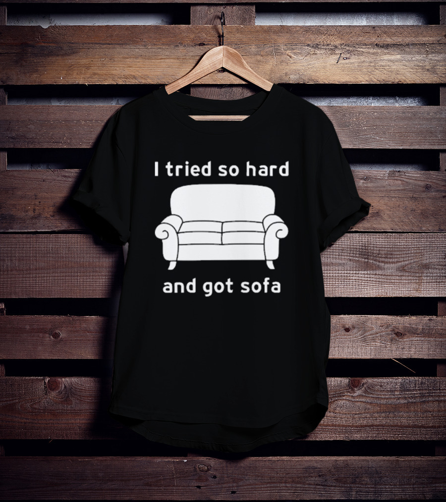 I Tried So Hard And Got Sofa Shirt made from 100% pre-shrunk ring-spun cotton, unisex regular fit based on U.S. standard sizing. The shirt is designed, cut, sewn, and printed in the United States. Available in sizes S-5XL.