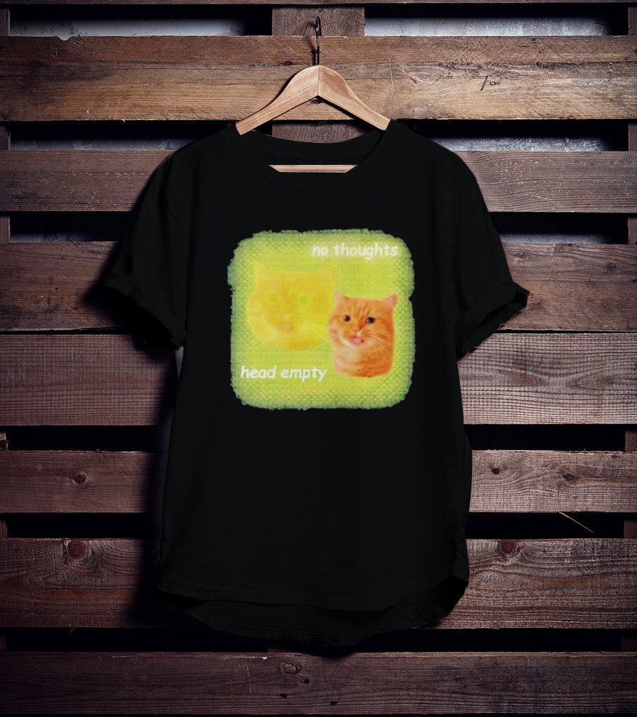 No Thoughts Head Empty Cat Meme Green Background Shirt made from 100% pre-shrunk ring-spun cotton, unisex regular fit based on U.S. standard sizing. The shirt is designed, cut, sewn, and printed in the United States. Available in sizes S-5XL.