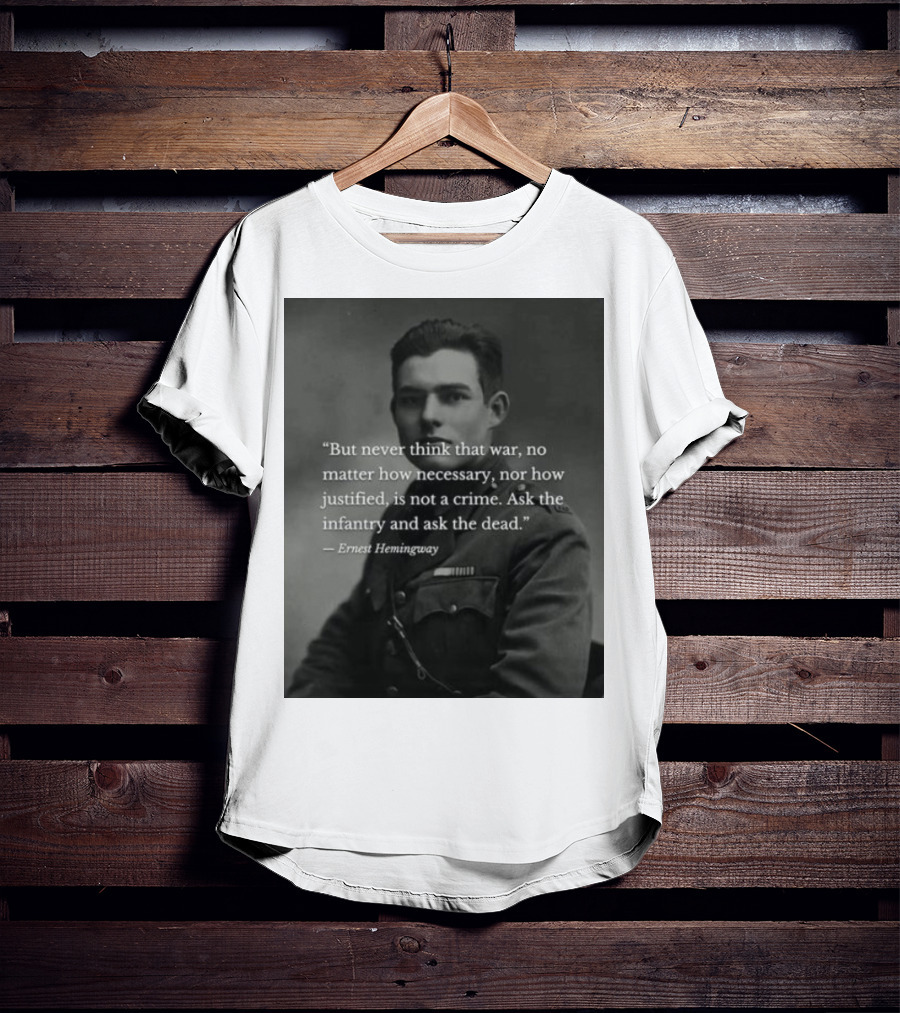 Ernest Hemingway But Never Think That War No Matter How Necessary Nor How Justified Is Not A Crime Ask the Infantry and Ask the Dead Shirt made from 100% pre-shrunk ring-spun cotton, unisex regular fit based on U.S. standard sizing. The shirt is designed, cut, sewn, and printed in the United States. Available in sizes S-5XL.