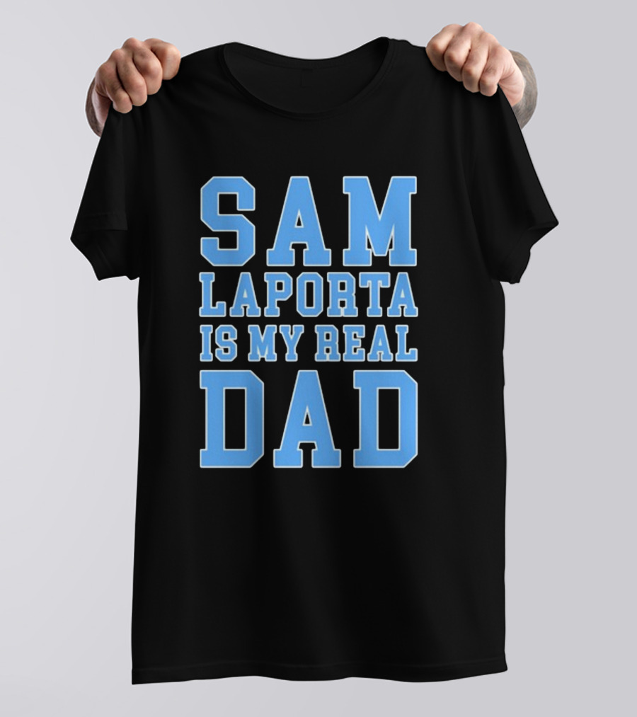 Sam Laporta Is My Real Dad Lions Fan Shirt made from 100% pre-shrunk ring-spun cotton, unisex regular fit based on U.S. standard sizing. The shirt is designed, cut, sewn, and printed in the United States. Available in sizes S-5XL.