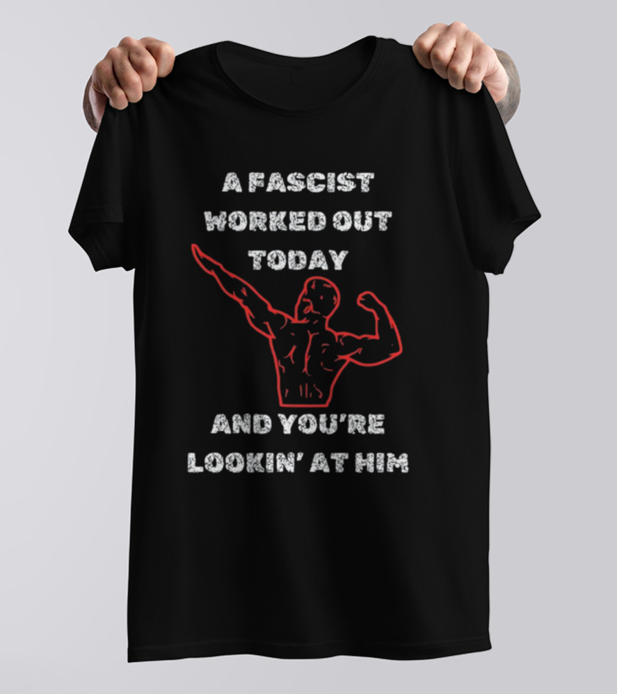A Fascist Worked Out Today And You're Lookin' At Him Muscle Pose Shirt made from 100% pre-shrunk ring-spun cotton, unisex regular fit based on U.S. standard sizing. The shirt is designed, cut, sewn, and printed in the United States. Available in sizes S-5XL.