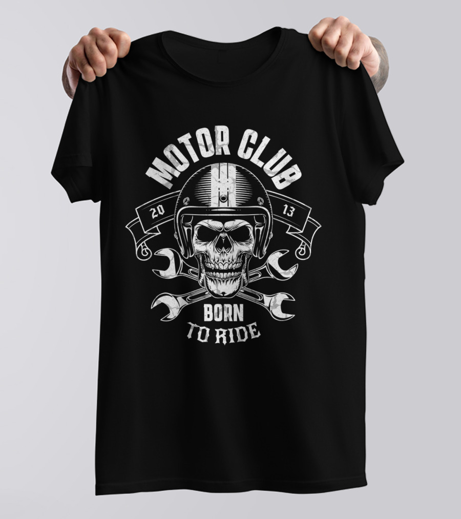 Motor Club 2013 Born to Ride Skull Shirt made from 100% pre-shrunk ring-spun cotton, unisex regular fit based on U.S. standard sizing. The shirt is designed, cut, sewn, and printed in the United States. Available in sizes S-5XL.