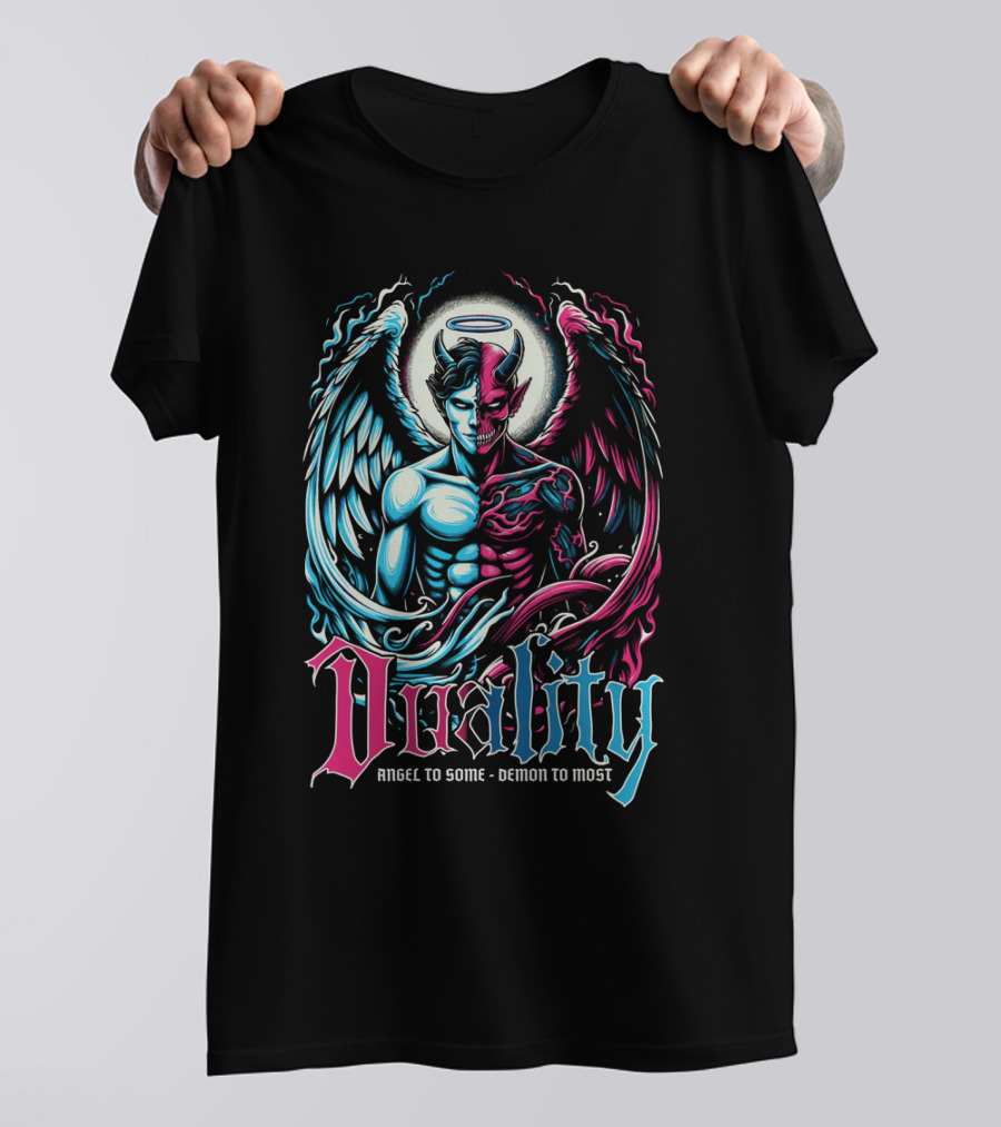 Duality Angel to Some Demon to Most Shirt made from 100% pre-shrunk ring-spun cotton, unisex regular fit based on U.S. standard sizing. The shirt is designed, cut, sewn, and printed in the United States. Available in sizes S-5XL.