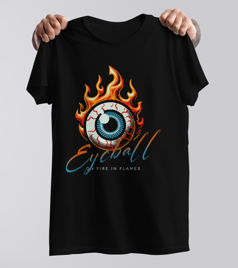 Eyeball on Fire in Flames Shirt made from 100% pre-shrunk ring-spun cotton, unisex regular fit based on U.S. standard sizing. The shirt is designed, cut, sewn, and printed in the United States. Available in sizes S-5XL.
