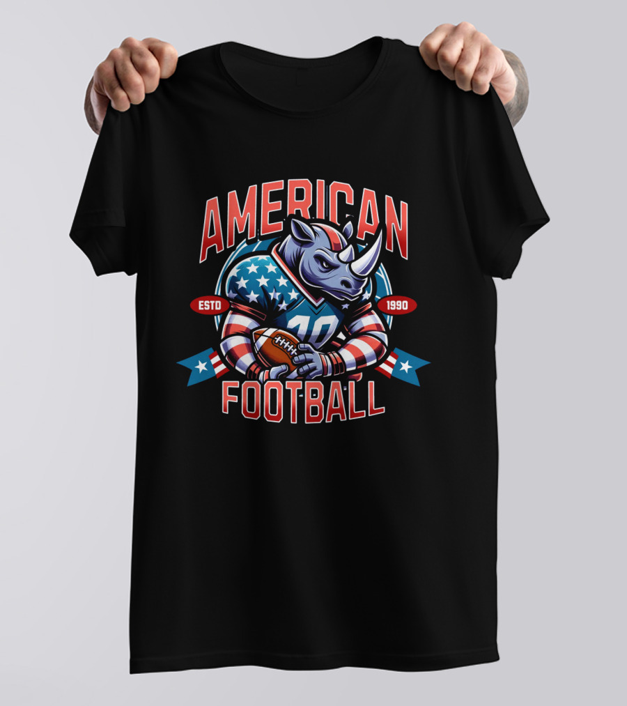 American Football Rhino Mascot ESTD 1990 Shirt made from 100% pre-shrunk ring-spun cotton, unisex regular fit based on U.S. standard sizing. The shirt is designed, cut, sewn, and printed in the United States. Available in sizes S-5XL.