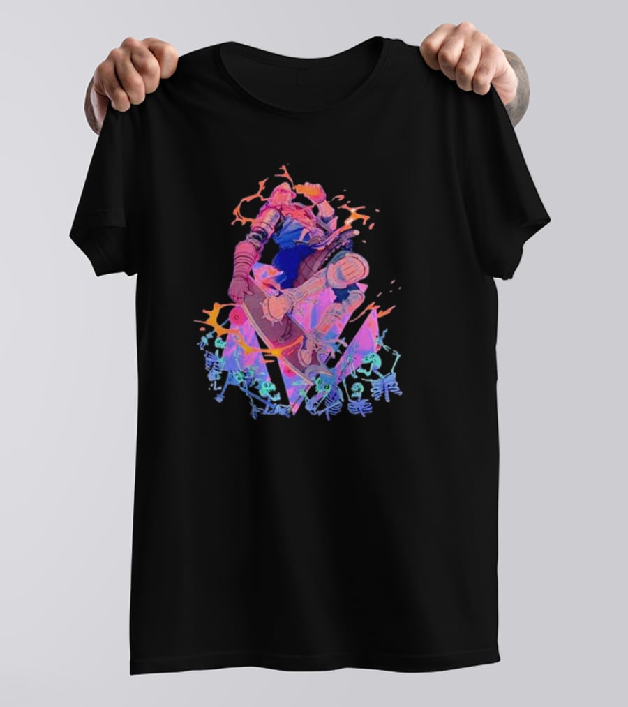 Skateboard Knight Neon Fantasy Warrior on Shredding Skeletons Shirt made from 100% pre-shrunk ring-spun cotton, unisex regular fit based on U.S. standard sizing. The shirt is designed, cut, sewn, and printed in the United States. Available in sizes S-5XL.