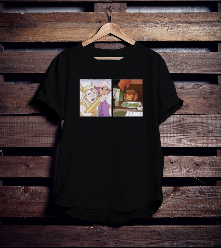 She-Ra Pointing at a Confused Catra Meme Scene Shirt made from 100% pre-shrunk ring-spun cotton, unisex regular fit based on U.S. standard sizing. The shirt is designed, cut, sewn, and printed in the United States. Available in sizes S-5XL.