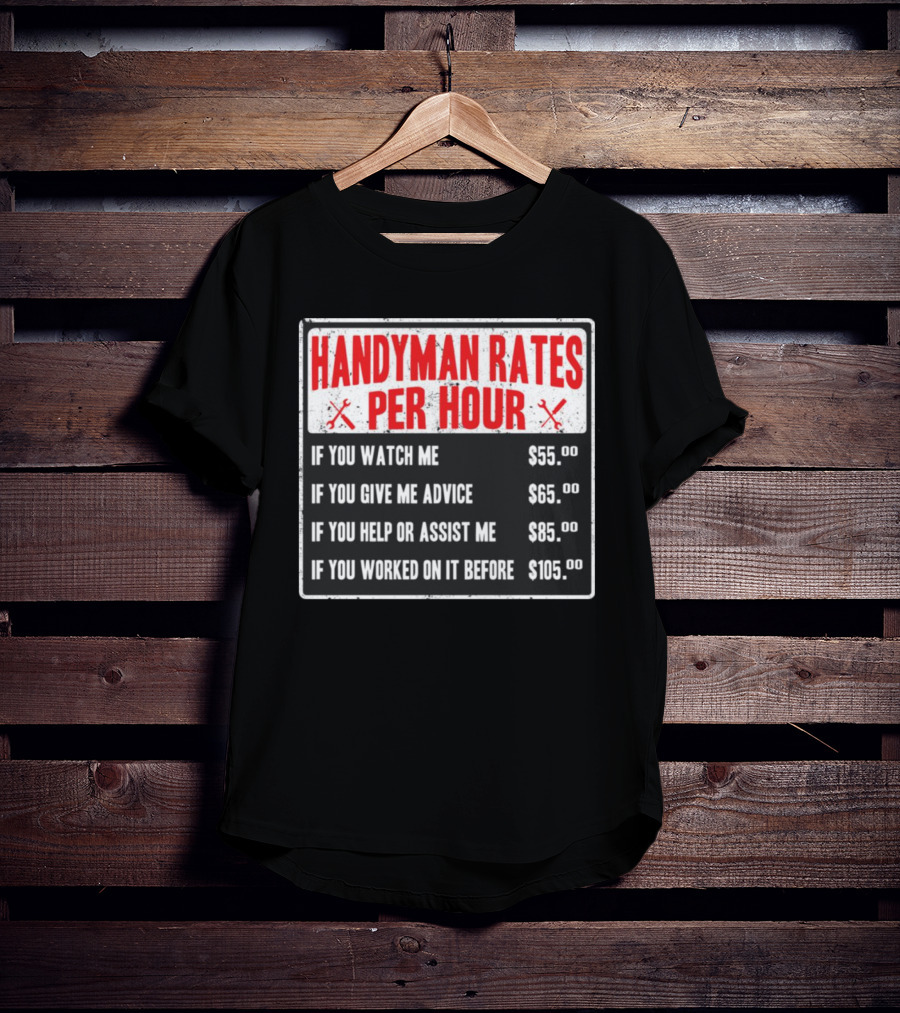 Handyman Rates Per Hour If You Watch Give Advice Help Assist Worked On Before Shirt made from 100% pre-shrunk ring-spun cotton, unisex regular fit based on U.S. standard sizing. The shirt is designed, cut, sewn, and printed in the United States. Available in sizes S-5XL.