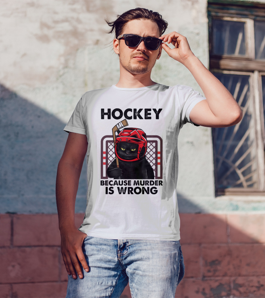 Hockey Cat in Red Helmet Because Murder is Wrong Shirt made from 100% pre-shrunk ring-spun cotton, unisex regular fit based on U.S. standard sizing. The shirt is designed, cut, sewn, and printed in the United States. Available in sizes S-5XL.