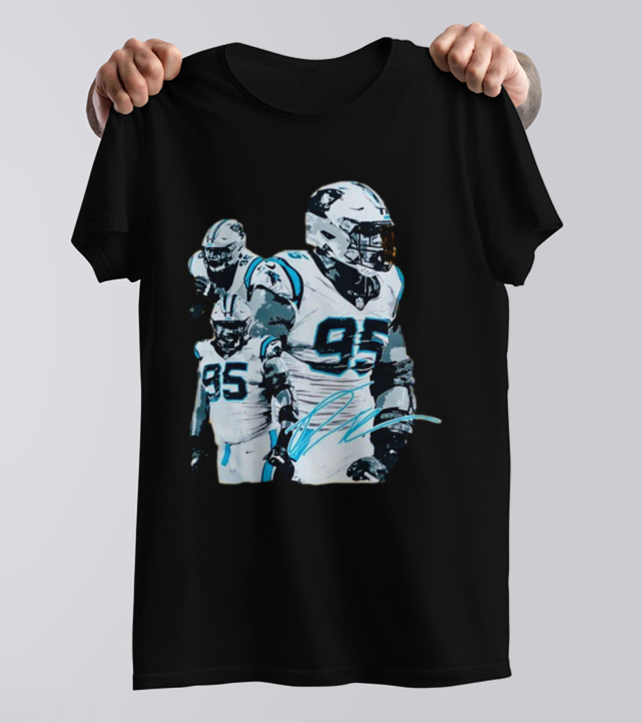 Kai Brown Wearing Carolina Panthers Derrick Brown 95 NFL Football Shirt made from 100% pre-shrunk ring-spun cotton, unisex regular fit based on U.S. standard sizing. The shirt is designed, cut, sewn, and printed in the United States. Available in sizes S-5XL.