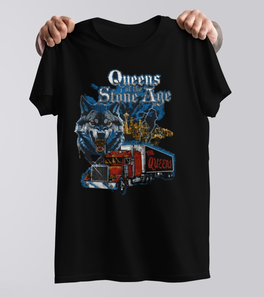 Queens Of The Stone Age Wolf Lightning Truck Seattle Skyline-The Queens Shirt made from 100% pre-shrunk ring-spun cotton, unisex regular fit based on U.S. standard sizing. The shirt is designed, cut, sewn, and printed in the United States. Available in sizes S-5XL.