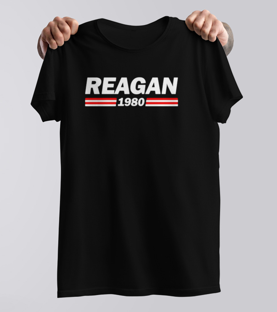 Reagan 1980 Campaign Vintage Style Retro Red White Stripes Shirt made from 100% pre-shrunk ring-spun cotton, unisex regular fit based on U.S. standard sizing. The shirt is designed, cut, sewn, and printed in the United States. Available in sizes S-5XL.