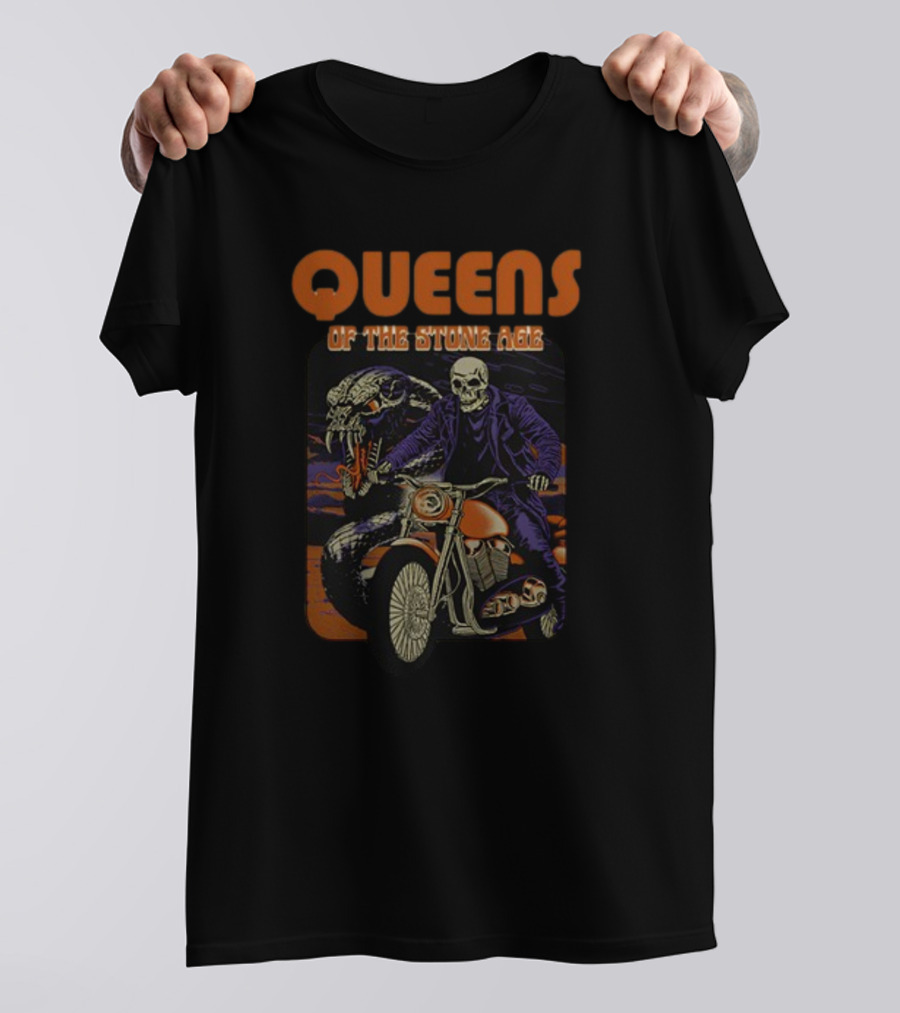 Queens Of The Stone Age Skeleton Biker with Snake Background Shirt made from 100% pre-shrunk ring-spun cotton, unisex regular fit based on U.S. standard sizing. The shirt is designed, cut, sewn, and printed in the United States. Available in sizes S-5XL.