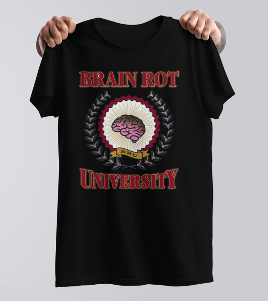 Shitheadsteve Brain Rot University BRU Brain Emblem Shirt made from 100% pre-shrunk ring-spun cotton, unisex regular fit based on U.S. standard sizing. The shirt is designed, cut, sewn, and printed in the United States. Available in sizes S-5XL.