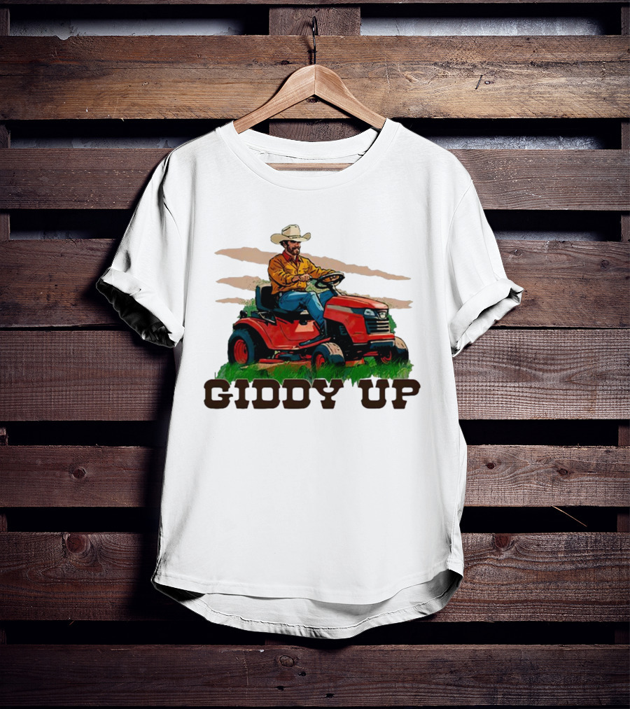Giddy Up Cowboy on Lawn Mower Shirt made from 100% pre-shrunk ring-spun cotton, unisex regular fit based on U.S. standard sizing. The shirt is designed, cut, sewn, and printed in the United States. Available in sizes S-5XL.