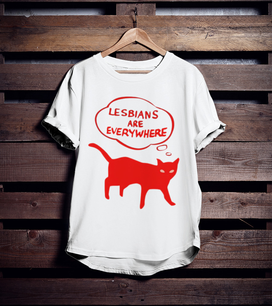 Lesbians Are Everywhere Red Cat Shirt made from 100% pre-shrunk ring-spun cotton, unisex regular fit based on U.S. standard sizing. The shirt is designed, cut, sewn, and printed in the United States. Available in sizes S-5XL.