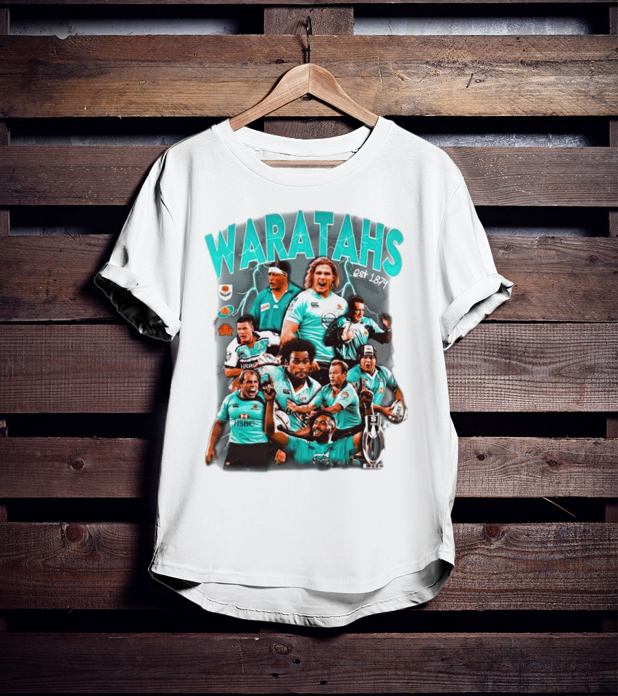 Waratahs Est 1874 Rugby Legends Portrait Featuring HSBC Team Players Shirt made from 100% pre-shrunk ring-spun cotton, unisex regular fit based on U.S. standard sizing. The shirt is designed, cut, sewn, and printed in the United States. Available in sizes S-5XL.