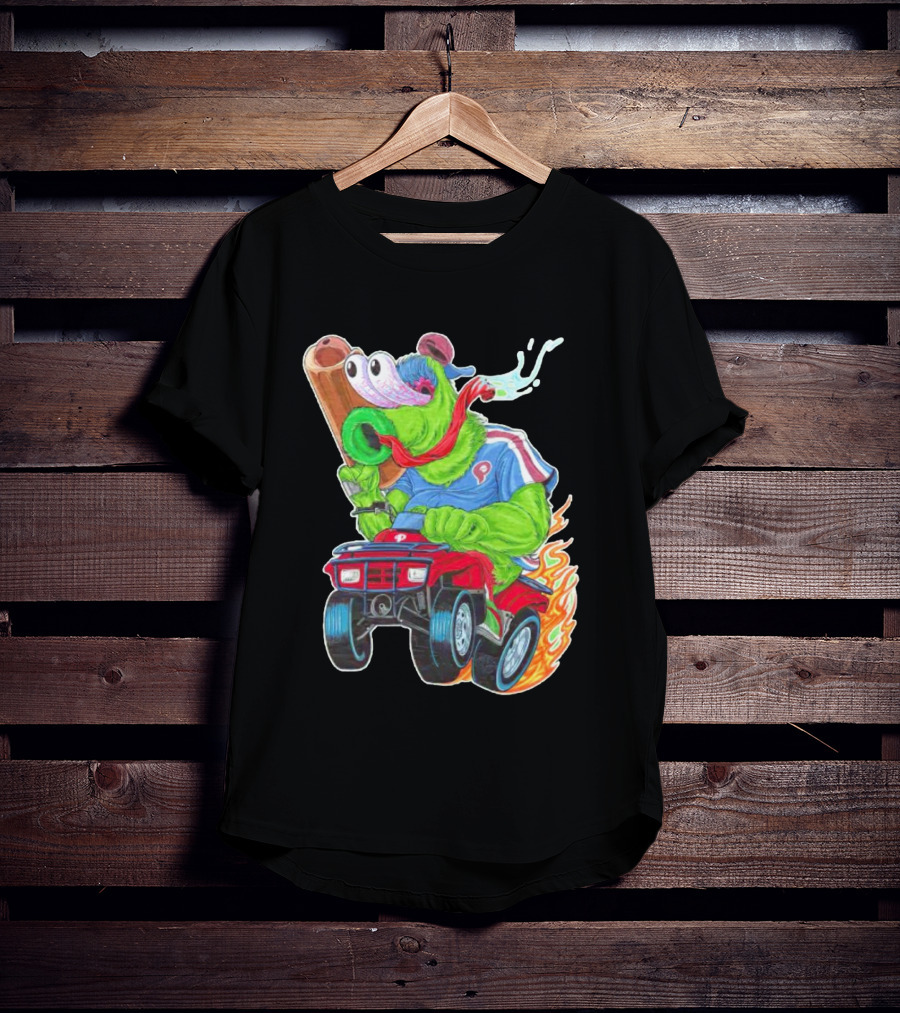Phillie Phanatic Philadelphia Phillies Pheast Mode Mascot with Cannon Riding ATV Shirt made from 100% pre-shrunk ring-spun cotton, unisex regular fit based on U.S. standard sizing. The shirt is designed, cut, sewn, and printed in the United States. Available in sizes S-5XL.