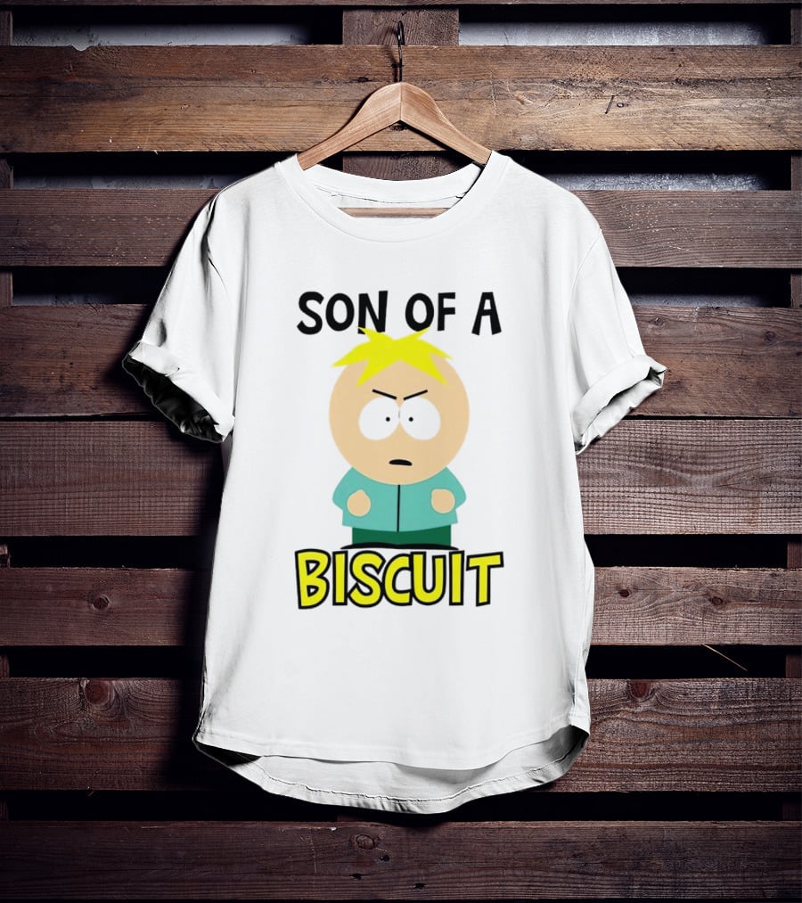 South Park Son of a Biscuit Butters Meme Shirt made from 100% pre-shrunk ring-spun cotton, unisex regular fit based on U.S. standard sizing. The shirt is designed, cut, sewn, and printed in the United States. Available in sizes S-5XL.