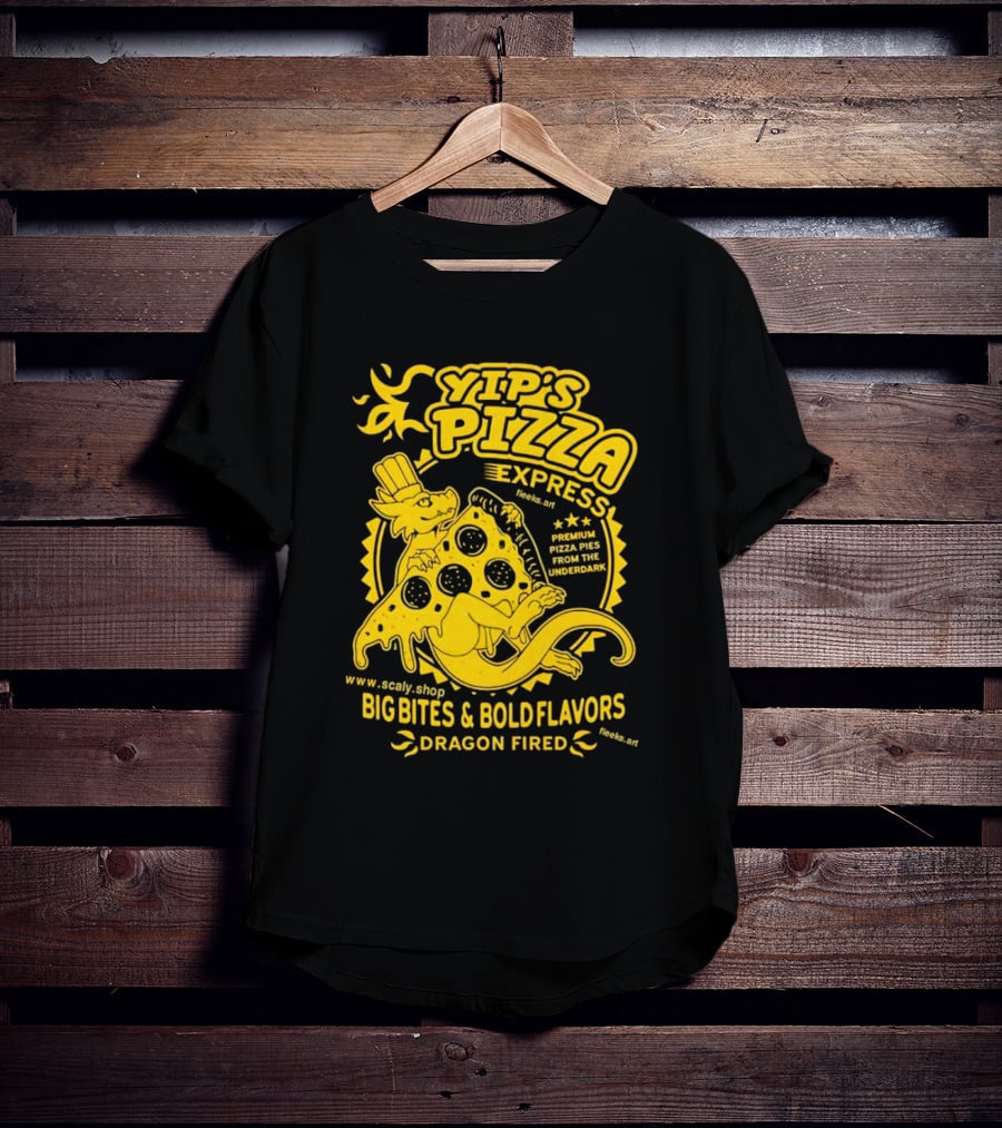 Yip's Pizza Express Dragon Fired Big Bites and Bold Flavors Premium Pizza Pies from the Underdark Shirt made from 100% pre-shrunk ring-spun cotton, unisex regular fit based on U.S. standard sizing. The shirt is designed, cut, sewn, and printed in the United States. Available in sizes S-5XL.