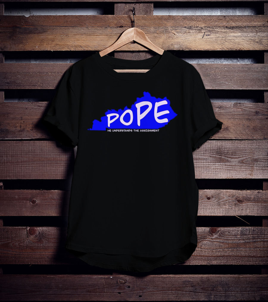 Pope He Understands the Assignment Kentucky Map Blue Text Shirt made from 100% pre-shrunk ring-spun cotton, unisex regular fit based on U.S. standard sizing. The shirt is designed, cut, sewn, and printed in the United States. Available in sizes S-5XL.