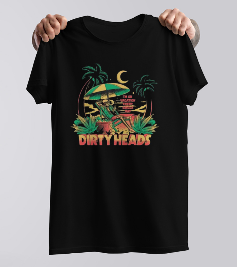 Dirty Heads I'm On Vacation Every Single Day 4-20 Tropical Skeleton Palm Trees Moon T-Shirt