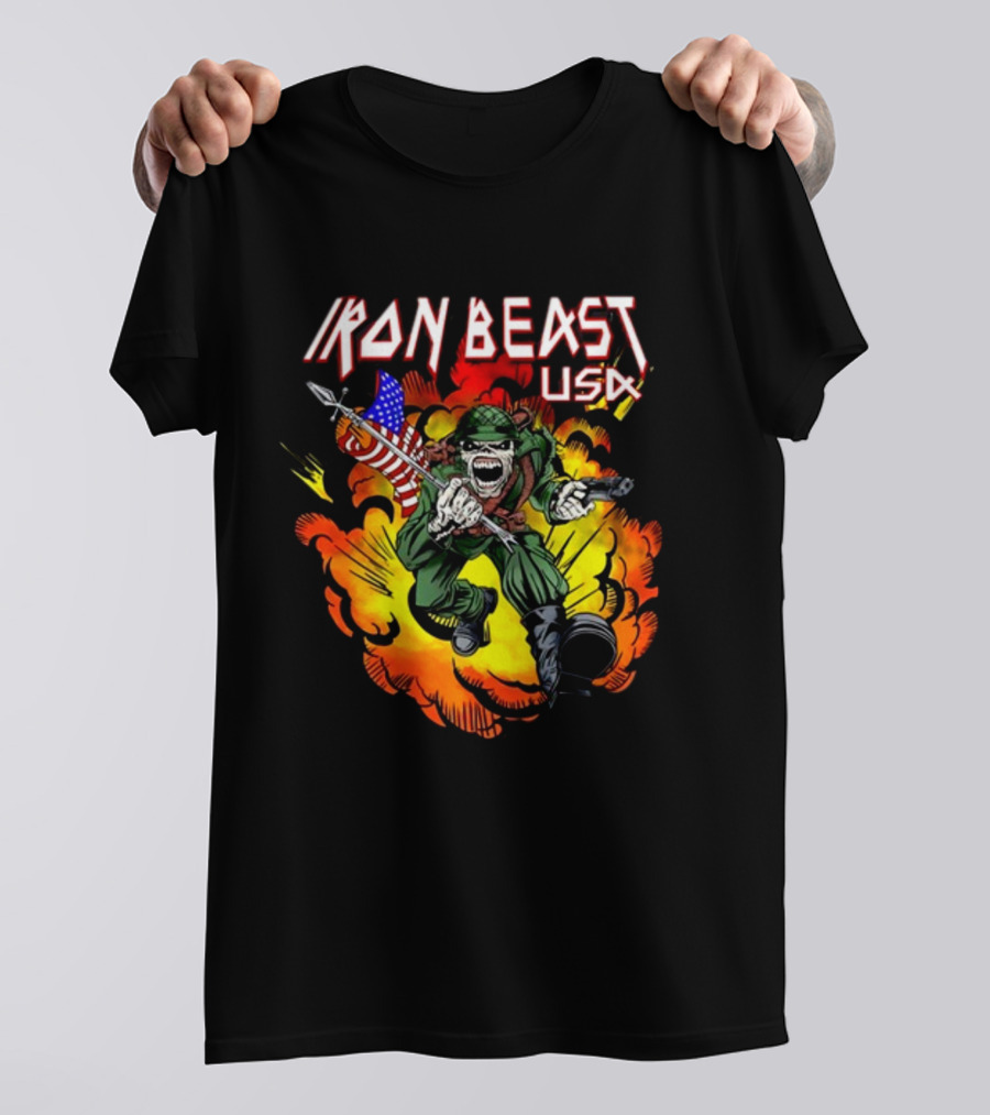 Iron Beast USA Explosive Soldier with American Flag Shirt made from 100% pre-shrunk ring-spun cotton, unisex regular fit based on U.S. standard sizing. The shirt is designed, cut, sewn, and printed in the United States. Available in sizes S-5XL.
