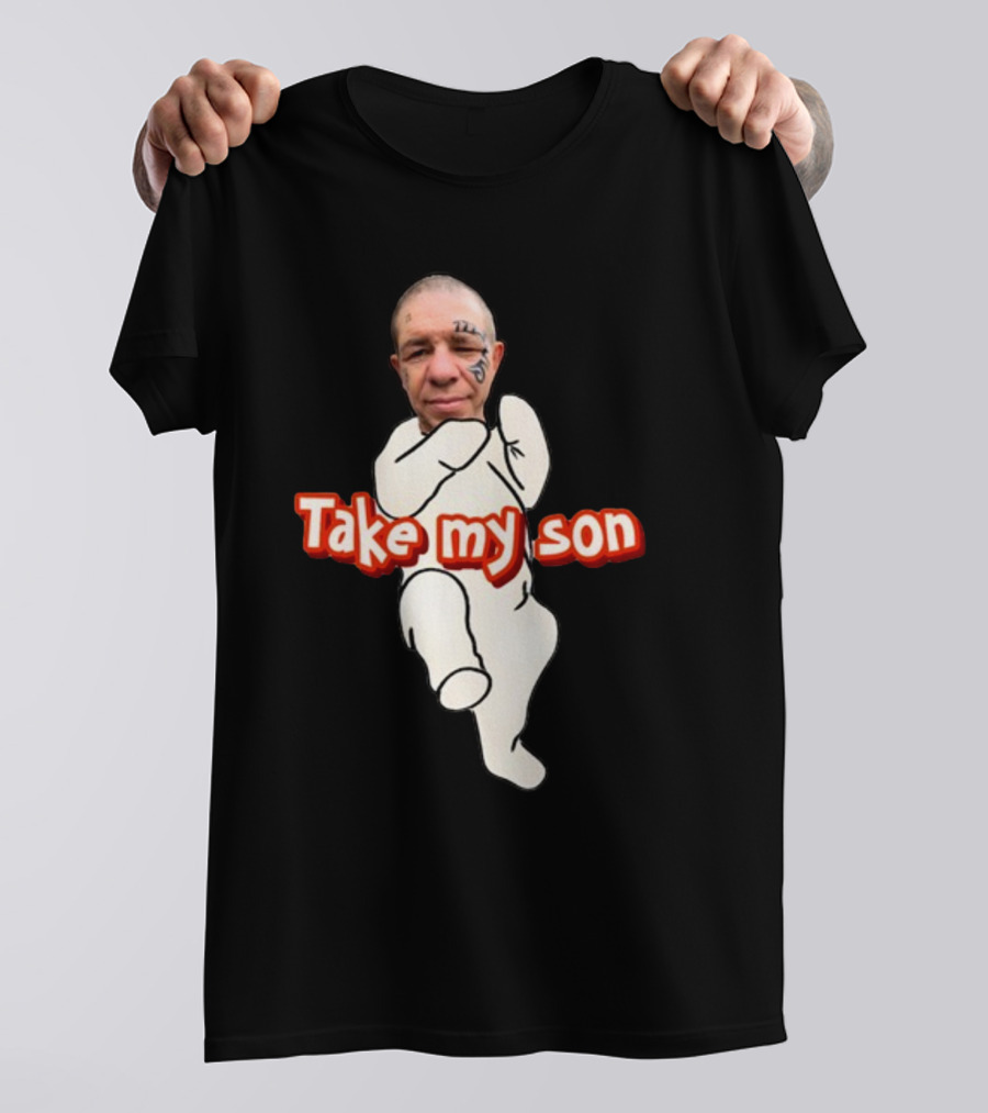 Tike Myson Take My Son Baby Drawing Tattoo Face Shirt made from 100% pre-shrunk ring-spun cotton, unisex regular fit based on U.S. standard sizing. The shirt is designed, cut, sewn, and printed in the United States. Available in sizes S-5XL.