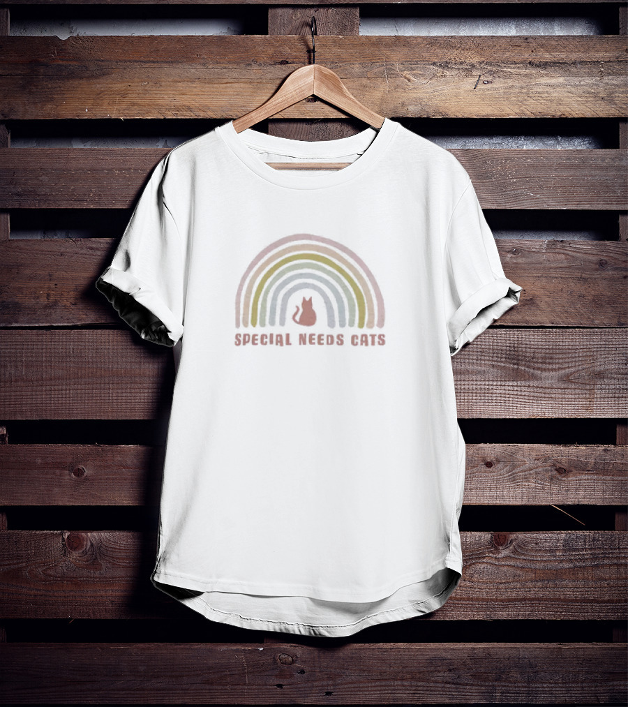 Radiclaw Creations Special Needs Cats The Rainbow Rebel Shirt made from 100% pre-shrunk ring-spun cotton, unisex regular fit based on U.S. standard sizing. The shirt is designed, cut, sewn, and printed in the United States. Available in sizes S-5XL.