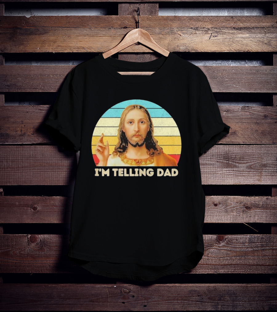 Christian Jesus I'm Telling Dad Retro Shirt made from 100% pre-shrunk ring-spun cotton, unisex regular fit based on U.S. standard sizing. The shirt is designed, cut, sewn, and printed in the United States. Available in sizes S-5XL.