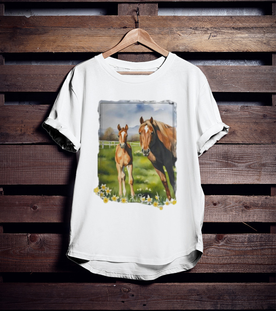 Ginger and Freddie Horses in Scenic Pasture with Daffodils Shirt made from 100% pre-shrunk ring-spun cotton, unisex regular fit based on U.S. standard sizing. The shirt is designed, cut, sewn, and printed in the United States. Available in sizes S-5XL.