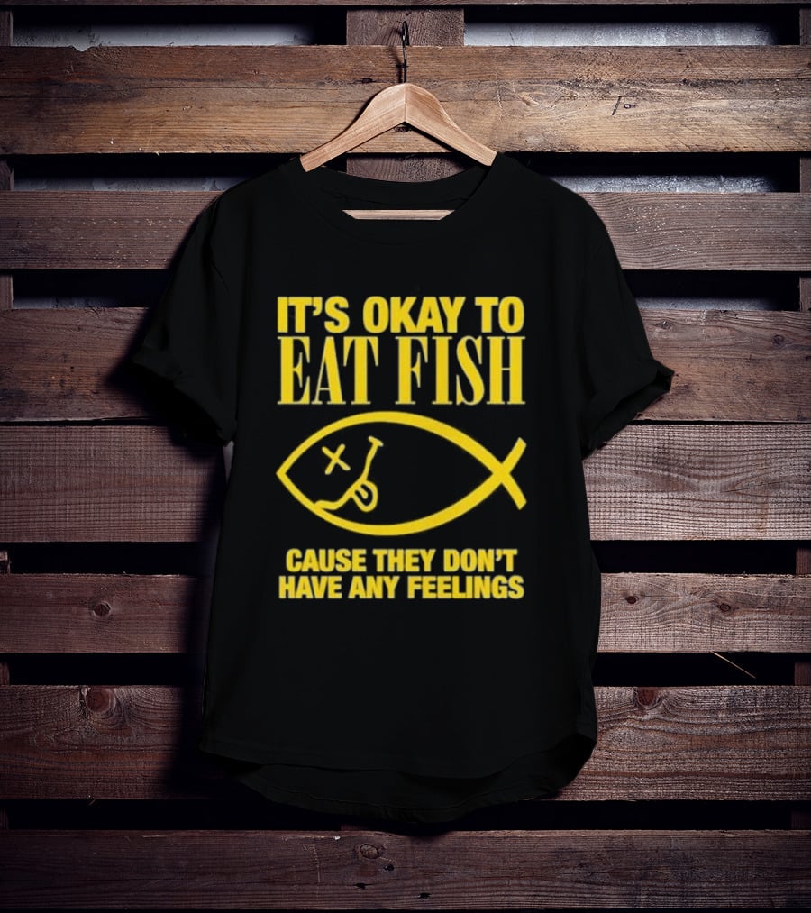 IT’S OKAY TO EAT FISH CAUSE THEY DON’T HAVE ANY FEELINGS Shirt made from 100% pre-shrunk ring-spun cotton, unisex regular fit based on U.S. standard sizing. The shirt is designed, cut, sewn, and printed in the United States. Available in sizes S-5XL.