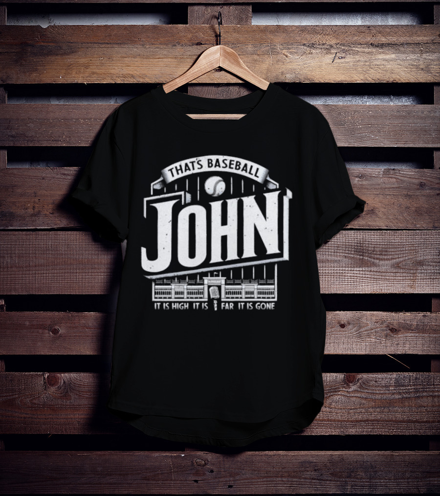 That's Baseball John It Is High It Is Far It Is Gone Stadium Microphone Baseball Shirt made from 100% pre-shrunk ring-spun cotton, unisex regular fit based on U.S. standard sizing. The shirt is designed, cut, sewn, and printed in the United States. Available in sizes S-5XL.