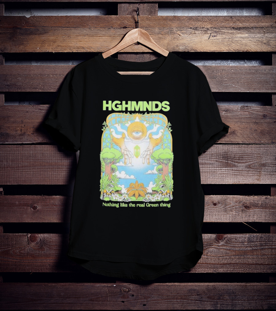 HGHMNDS Nothing Like the Real Green Thing Eye and Hands Above Nature Scene Shirt made from 100% pre-shrunk ring-spun cotton, unisex regular fit based on U.S. standard sizing. The shirt is designed, cut, sewn, and printed in the United States. Available in sizes S-5XL.
